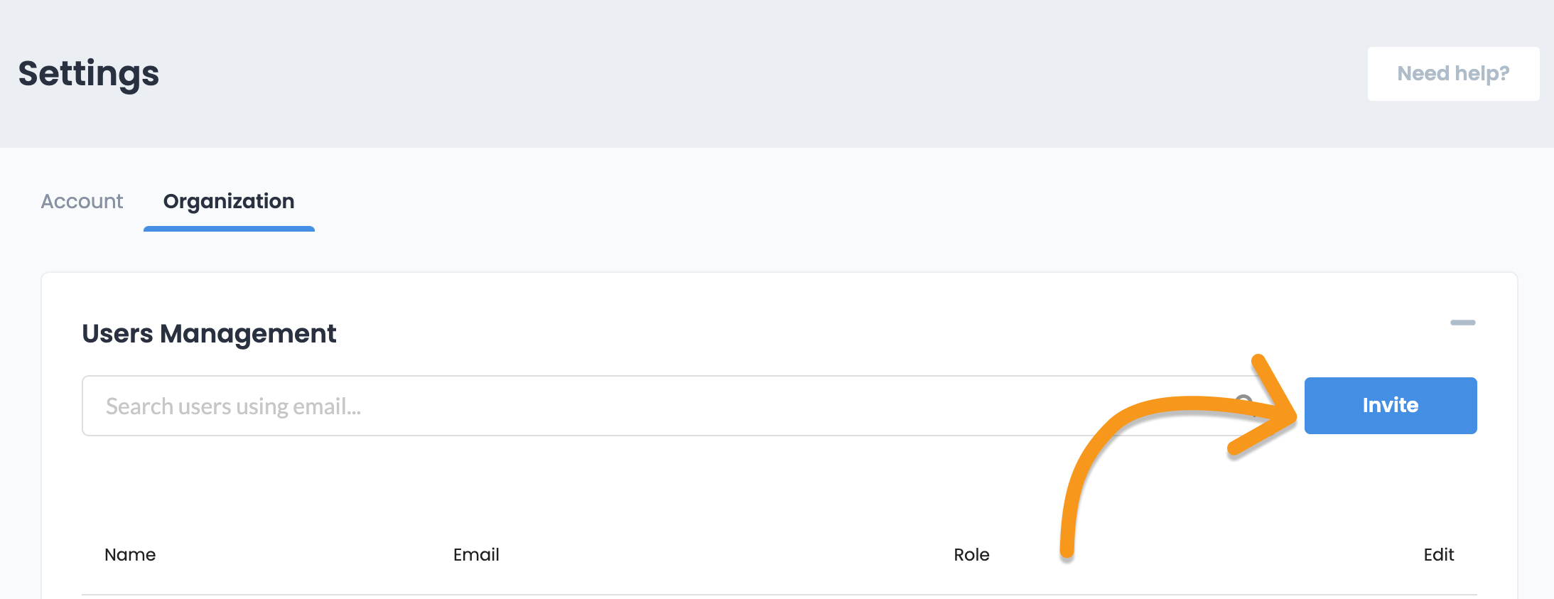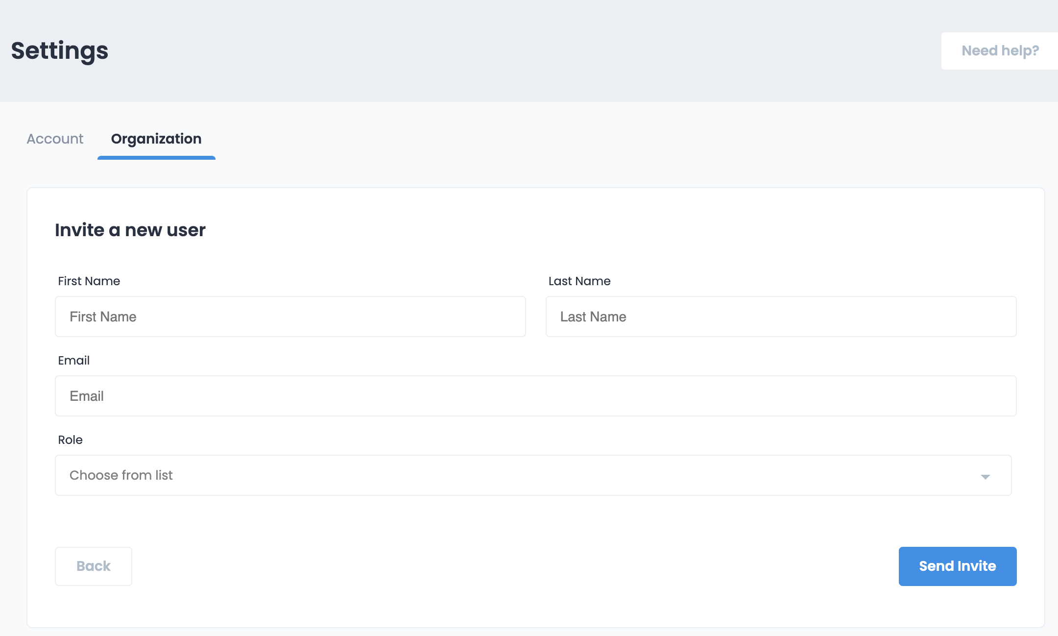 Users with "Admin" permissions can invite users. To add new users to your account you will need an email and determine the user's role.