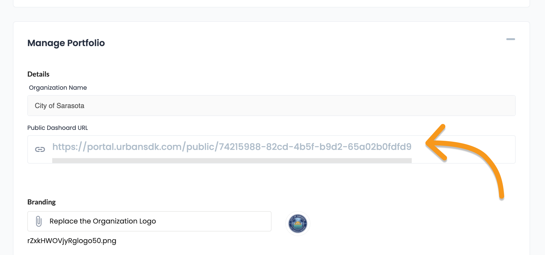 Urban SDK will initially add Name, Logo and select primary colors for you. Admin users can change the branding of the Portfolio by adding a Public Organization Name, Logo and setting the primary colors for navigation links.