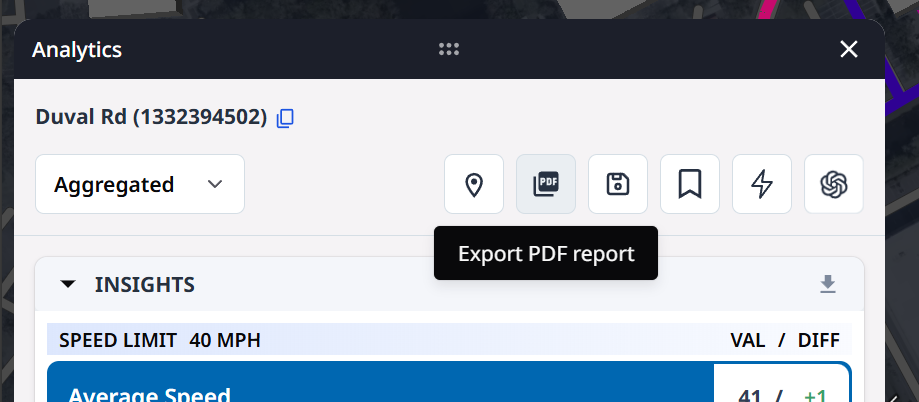 - Click the PDF Export button at the top of the Analytics Panel
