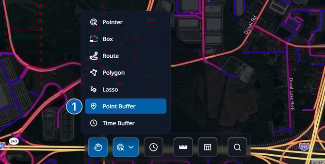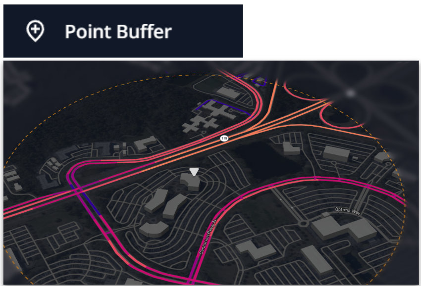 The Point Buffer selection enables you to quickly draw a circle radius around a selected point to select all the links within. Used to assess proximity-based coverage and service reach.
