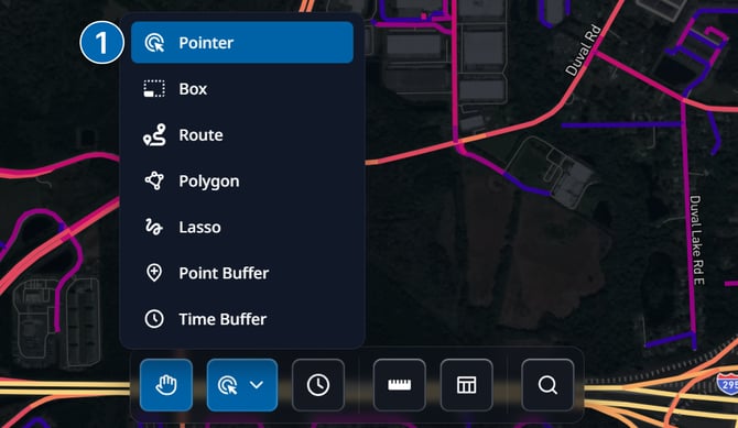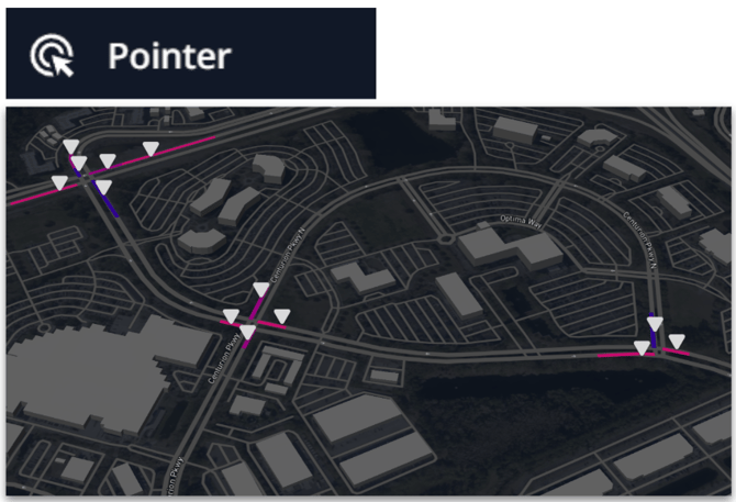 The pointer selection enables you to click one or more links directly on the map to target multiple specific segments to analyze together. This is useful for quickly aggregating several links along a stretch of roadway, or to select specific links like Intersection approaches.