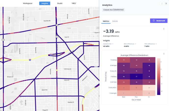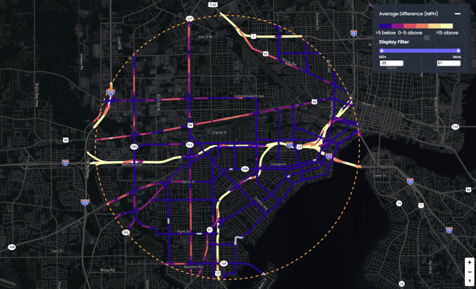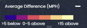 - Average Difference: Quantifies the difference between the speed limit and average speed of observed trips along a road segment. It is provided in miles per hour (mph).