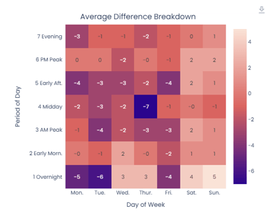 💡Tip: The chart colors are designed to make it easy to quickly pinpoint the periods of the day where values are highest or lowest, as well as at what times those anomalies occur.