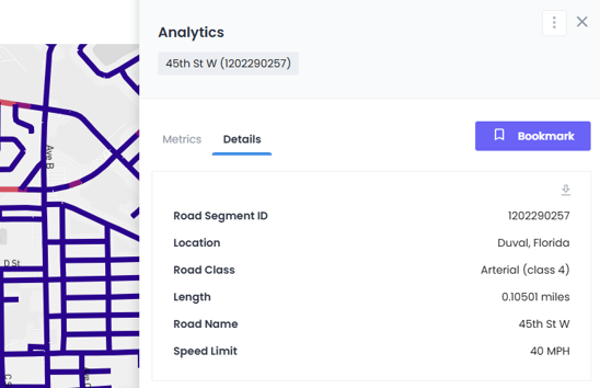 While a data layer is selected and visible in the Map View, customers can select individual road segments to bring up the Data Panel which consists of two tabs: the Analytics Tab, and the Details Tab.